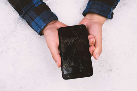 Smartphone with a broken display in the hands of a teenager