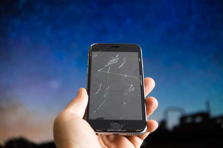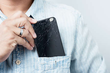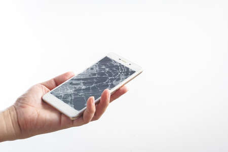 Man hand holding mobile phone with broken screen
