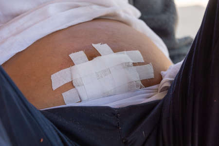 Mark and ecchymosis after blood collection, Person tearing off the patch with a dressing from the needle injection site by a nurse,