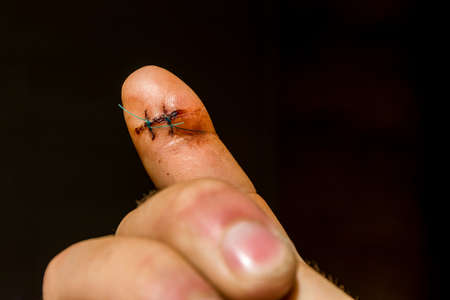 Close up of man hand with sutured wound on finger. Injured, Helth and medical Concept.
