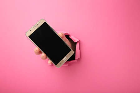Closeup of female hand holding smartphone with white empty screen showing device close to camera breaking through pink paper sheet. Gadget display with free copy space, mockup. top view