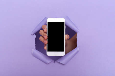 Shot of person's hand in the purple paper hole holding smartphone with black blank screen for advertisement or promotional text. mobile application.