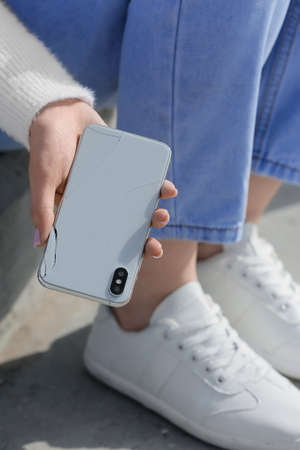 Woman with damaged mobile phone outdoors, closeup