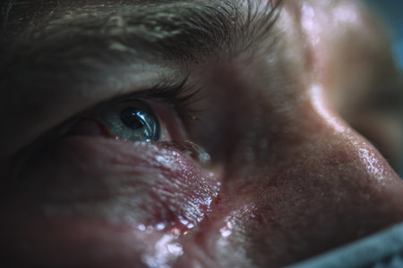 A dramatic close-up of an eye expressing emotional distress, captured with a shallow depth of field. The image highlights the texture and detail, evoking a sense of urgency and realism.