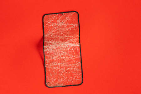 Black crashed smartphone with broken screen on black isolated background. Mobile phone with cracked display glass. Modern phone with cracks on the touchscreen. Destroyed Gadget. Repair concept.