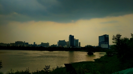 cityscape of Seoul at dusk with Yeouido Park underneath