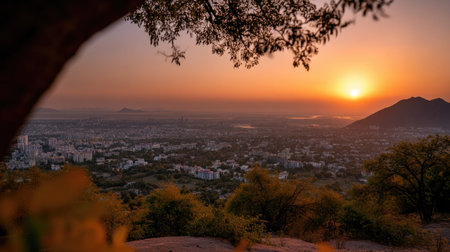 This stunning image captures a vibrant sunset over a sprawling urban landscape, framed by distant mountains and rich foliage.