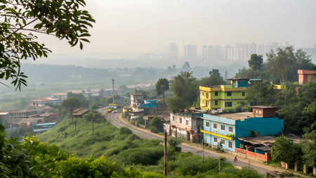 mumbai city skyline aerial view image showing metro rail between slums and new constructions