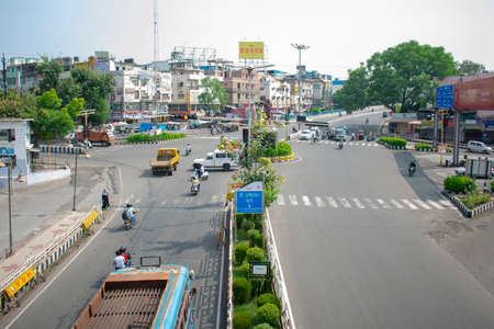 Gulbarga, India-September 30th 2021; Scenic view of Indian city street surrounded by residencial building and commercial shop. electric pole in the middle of the road, vehicle moving forward in India.