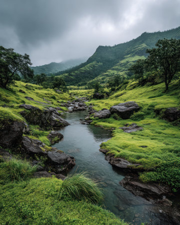 A serene lush green landscape with flowing stream, surrounded by vibrant grass, rocks, and hills under cloudy sky
