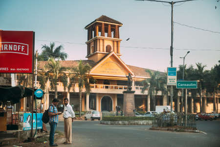 Mapusa, Goa, India - February 19, 2020: Traffic on road near Shree Hanuman temple.