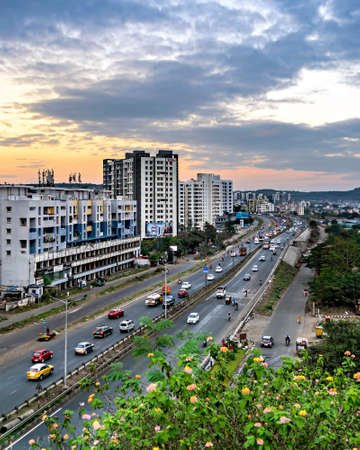 Pune,India-September 2nd, 2017: Slow shutter speed image of beautiful sky , buildings and flowing traffic on motorway.