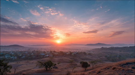 Breathtaking view of a sunrise illuminating rolling hills, featuring misty landscapes and greenery, evoking tranquility and the beauty of nature's pristine mornings.