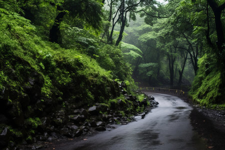 Lush green mountains with mist and clouds create a dramatic natural landscape.
