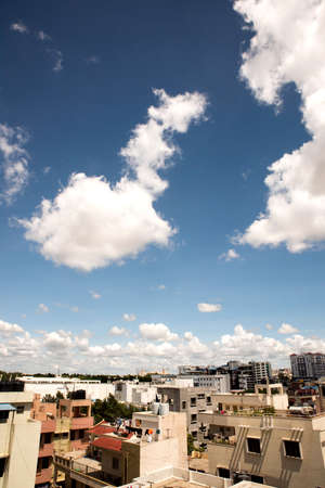 The rooftops of the buildings with a hazy smog of the skyline of suburb of Kandivali in the city of Mumbai.