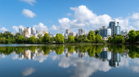 A stunning view of a serene urban lake displaying perfect reflections of lush green trees and clear blue skies, highlighting modern city buildings.