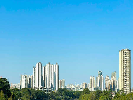 An aerial view of a vibrant city skyline showcases modern architecture, lush greenery, and a bright blue sky filled with fluffy clouds. This image captures the essence of urban life and development.