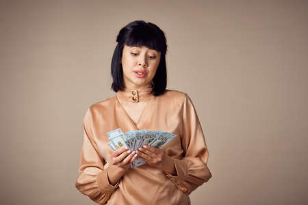 emotional woman with money in hands finance positive