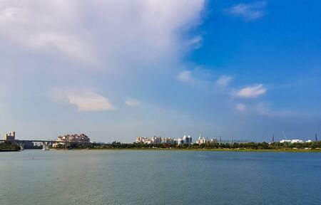 Sanya, Hainan, China - 26.06.2019: Sanya Cityscape with Sanya River View and Apartment Buildings in the sunset time in Hainan Province, China