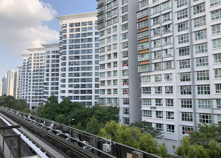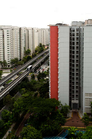 Singapore-24 MAR 2018: A transit subway on elevated rails through a public housing estate. Singapore's subway is the second-oldest metro system in Southeast Asia