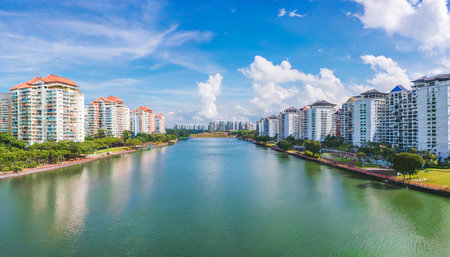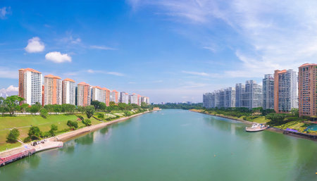 panoramic view of singapore public housing apartments in punggol district singapore housing development board hdb with beautiful water way and blue sky