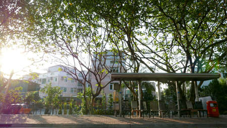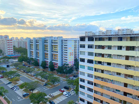 Residential apartment, flat (HDB) estate with parking lot during sunset in Singapore