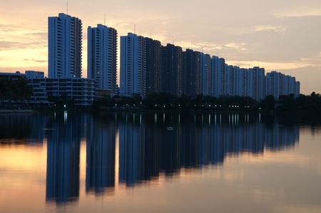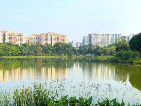 Beautiful lakeview scenery with reflection and residential building at the background