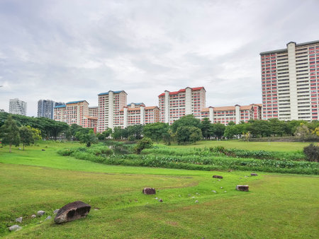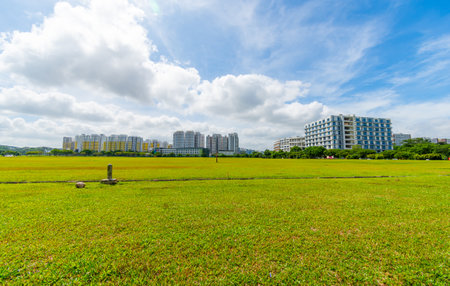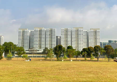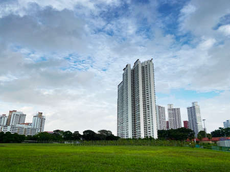 Singapore housing blocks (HDB) across green field under cloudy blue sky