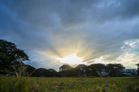 view of footbal field in evening sunset and black cloud.