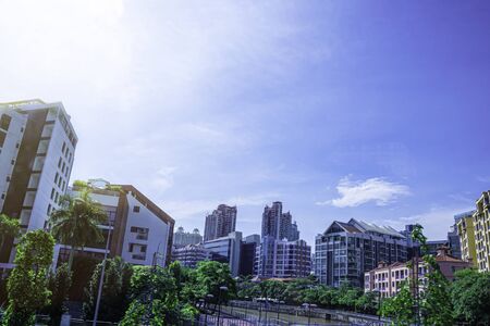 Top view of modern building with bright sky clouds, City scape background, Skyscraper with green tree background, Singapore city