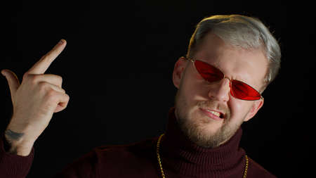 Angry man expressing abhorrence in dark backround. dramatic lights