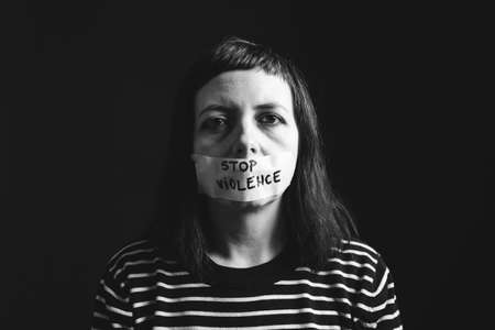 Women violence and abused concept. Stop domestic violence against women and human trafficking.Woman with tape on mouth and stop violence text