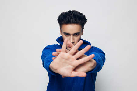 photo of a handsome, stylish man with thick black hair standing on a light gray background in a blue zip-up sweater and charmingly looking into empty space and covering the camera with his hand