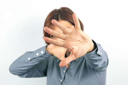 girl shutting out from view. private life and paparazzi concept. woman putting hands forward blocking unwanted attention. portrait of young woman on blue background.