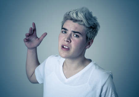 Portrait of young attractive transgender teenager man with angry face. Looking mad and furious. Facial expressions and emotions. Isolated on neutral background.