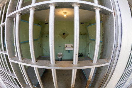 Close up Prisoner steel cage, Prison cell with jail iron bars for criminals, Old prison with bars locked up
