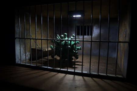 virus lockdown creative concept. virus novel miniature trapped inside old prison. Creative artwork decoration. Selective focus