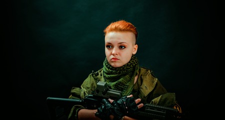 Vicious feminine armed fighter with rageful eyes . High quality photo