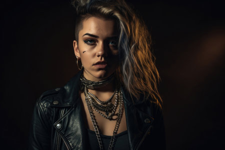 Rebellious and edgy portrait of a woman with a punk-rock attitude, wearing leather and chains and flaunting her individuality