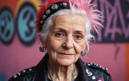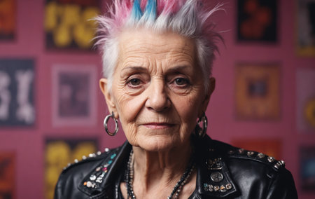 Mature punk woman. Portrait of elderly female with bright image, daring style. Generative AI