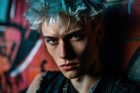 Young person with platinum hair and intense expression, standing against a colorful brick wall with graffiti. Dramatic lighting casts shadows on the face, emphasizing sharp features