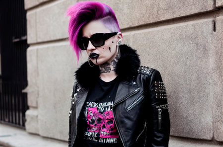 A woman with pink hair wearing a leather jacket. AI generative image.
