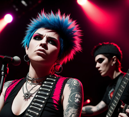 A man and a woman standing together, side by side, looking towards the camera, A punk rock concert with eccentric clothing styles, AI Generated