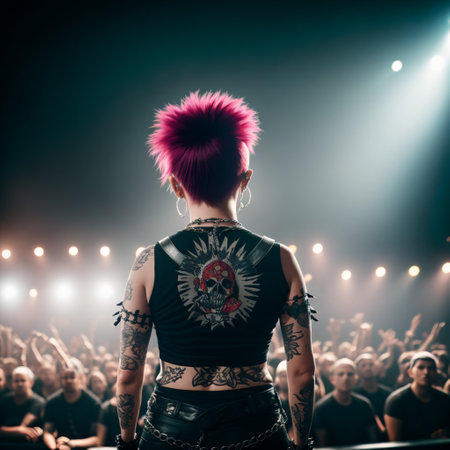Back view of a punk girl with tattoos on her body standing in front of a crowd at concert.