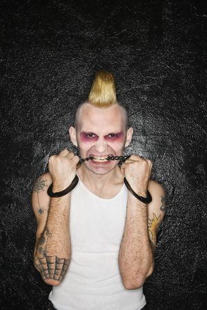 Mid-adult Caucasian male punk biting handcuffs.