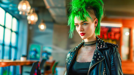 Young woman with green mohawk and studded leather jacket stands confidently in urban cafe, embodying individuality, alternative style, and self-expression. Concept of diversity and modern subcultures