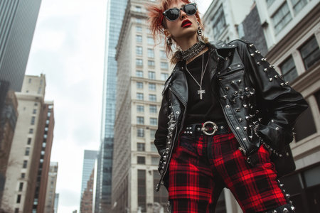 Stylish person stands confidently on a city street, wearing a spiked leather jacket and plaid pants. Urban skyscrapers loom in the background as they capture the essence of modern fashion.