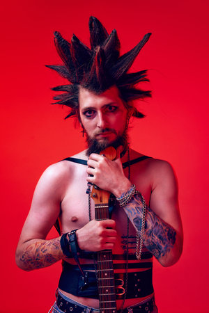 Deep look. Portrait of creative young man, punk, musician posing with electric guitar against red studio background in neon light