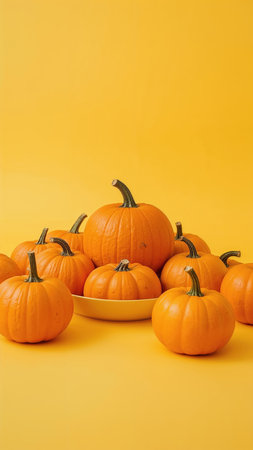 A collection of small and medium-sized orange pumpkins neatly arranged on a white plate, set against a bright yellow background. Perfect for autumn themes.