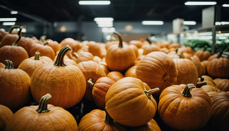 A vibrant display of fresh pumpkins fills the supermarket counter, showcasing their rich orange color, perfect for fall decor and seasonal cooking. Generative AI.